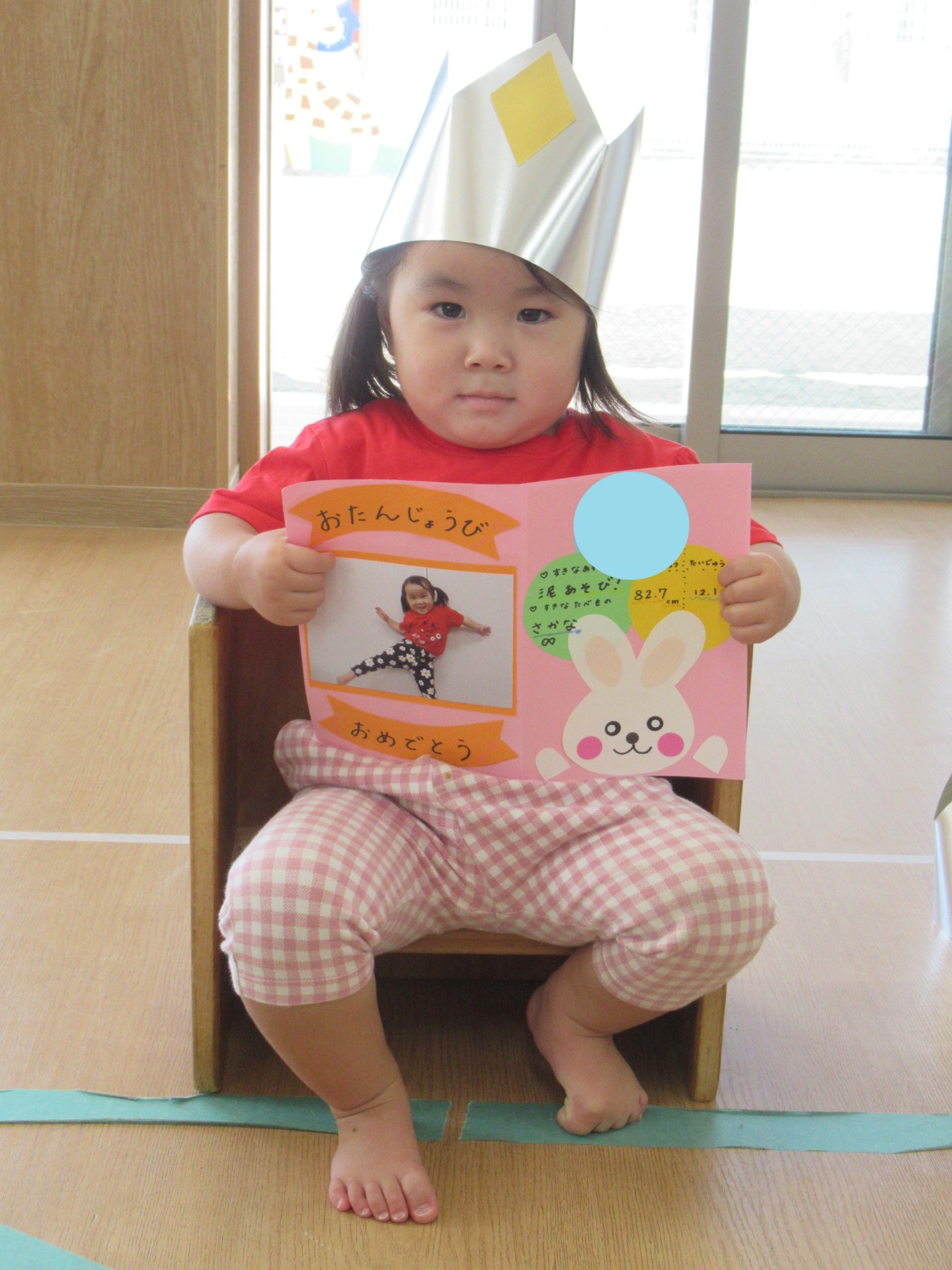6名のお友だちが前に出て、みんなからたんたんたんじょうびの歌と、「おめでとう!」の言葉とともにお祝いしてもらいました🎵
