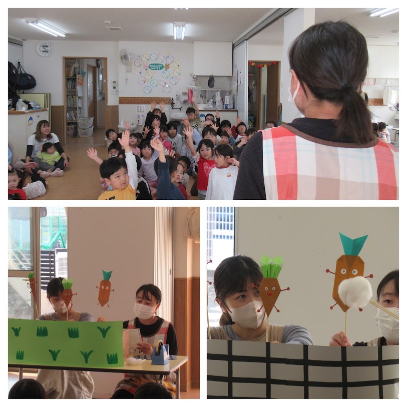 始めに、先生が「これから始まるお話にお野菜が出てくるんだけど、何が出るか分かるかな?」という問題に、みんな考えながらも手を挙げて、「トマト!」「人参!」「玉ねぎ!」など色んな野菜を答えていましたよ!