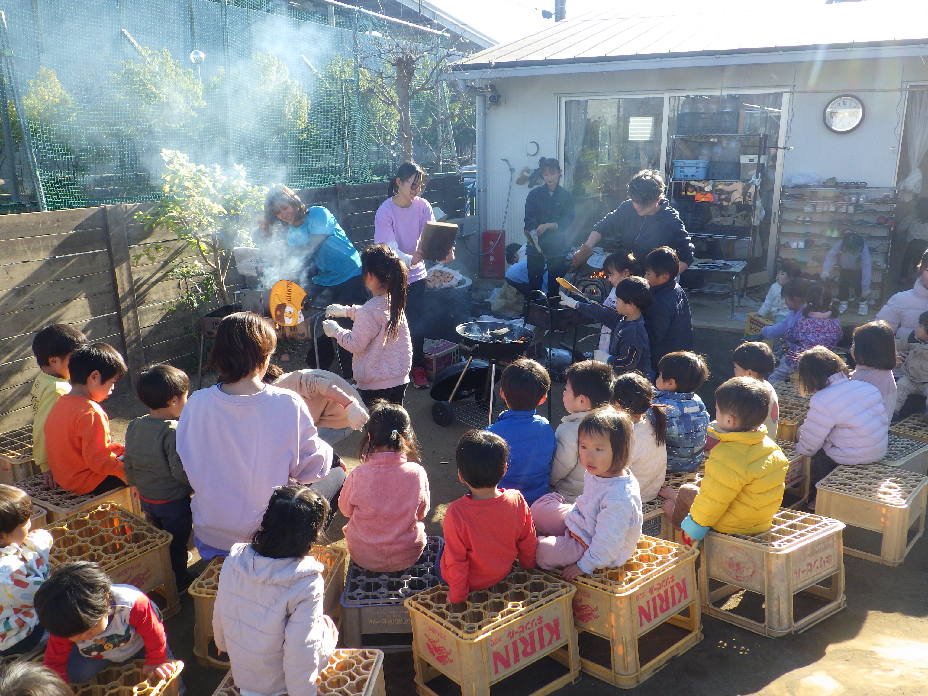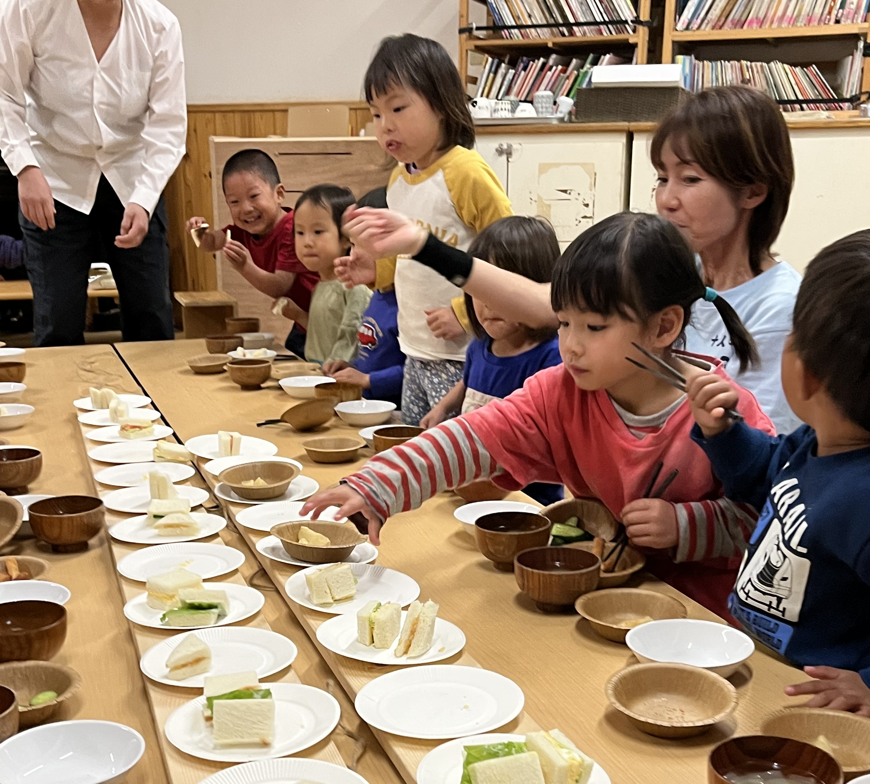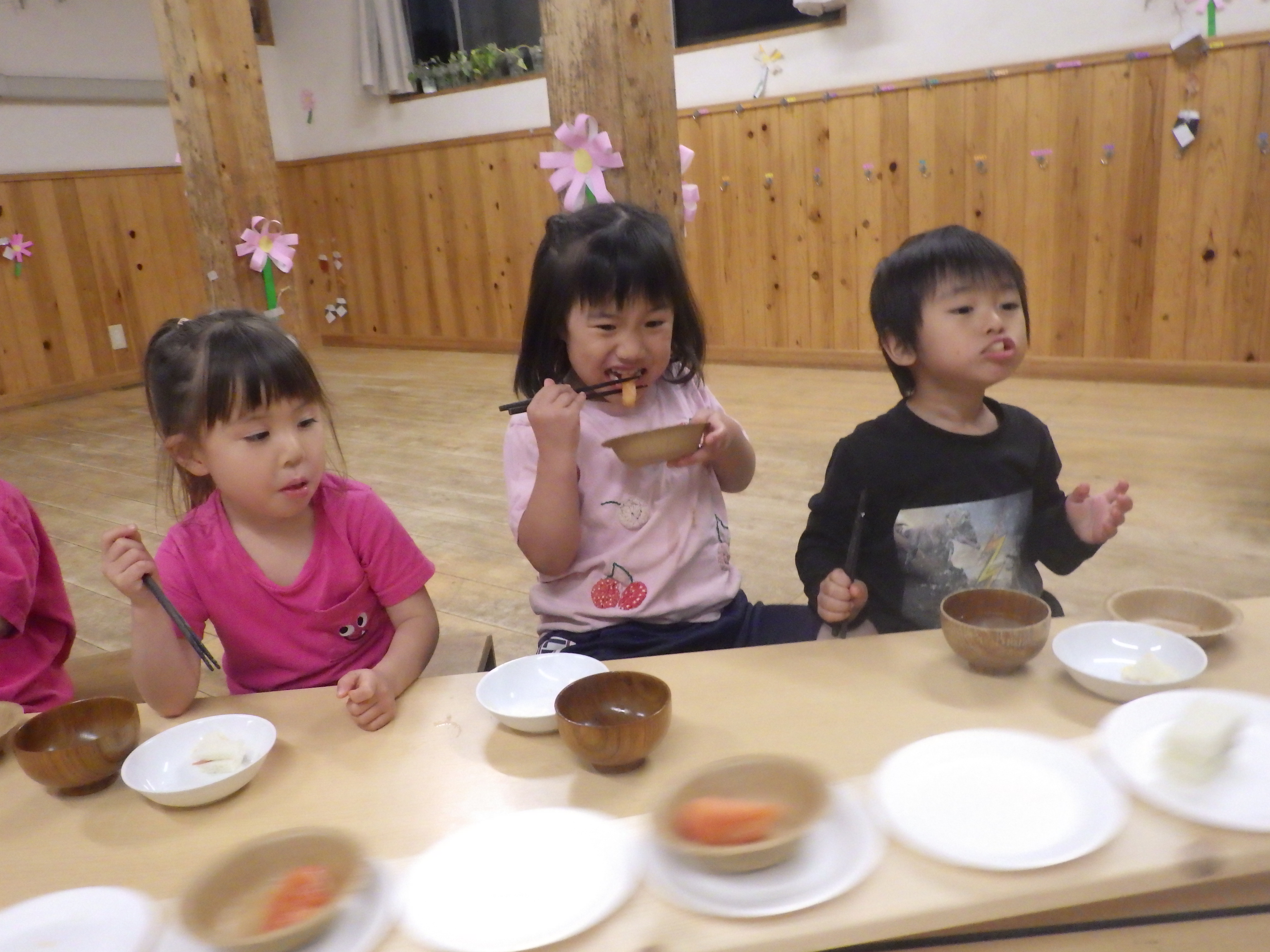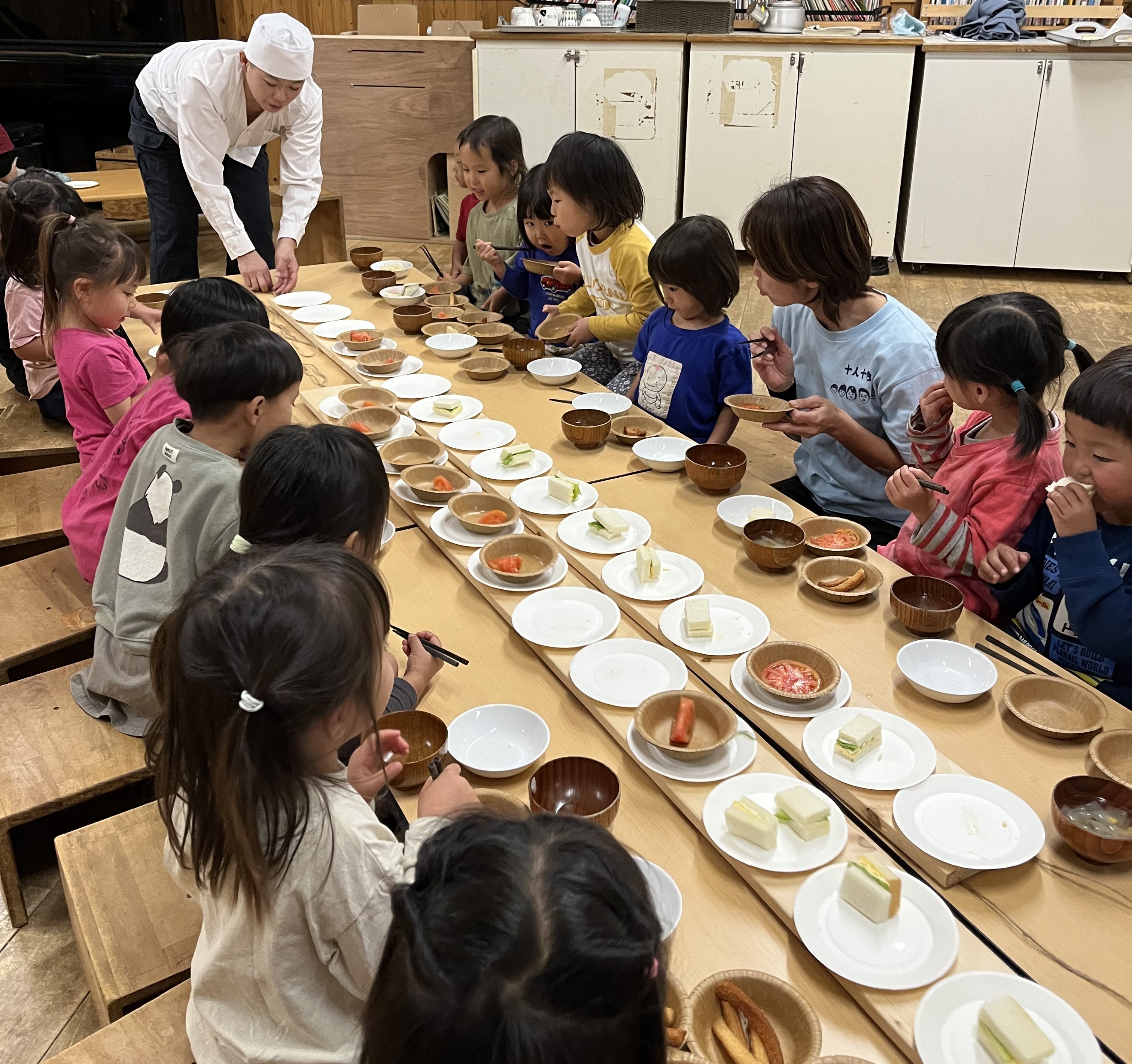 午前中の遊び、活動の途中で聞こえてくる包丁の音、食器の音、そしてだしの香り…子どもたちは自然と「きょうのごはんなあに?」と給食室に集まってきます。視覚・聴覚・嗅覚から子どもたちも食べる意欲は膨らんでいきます。