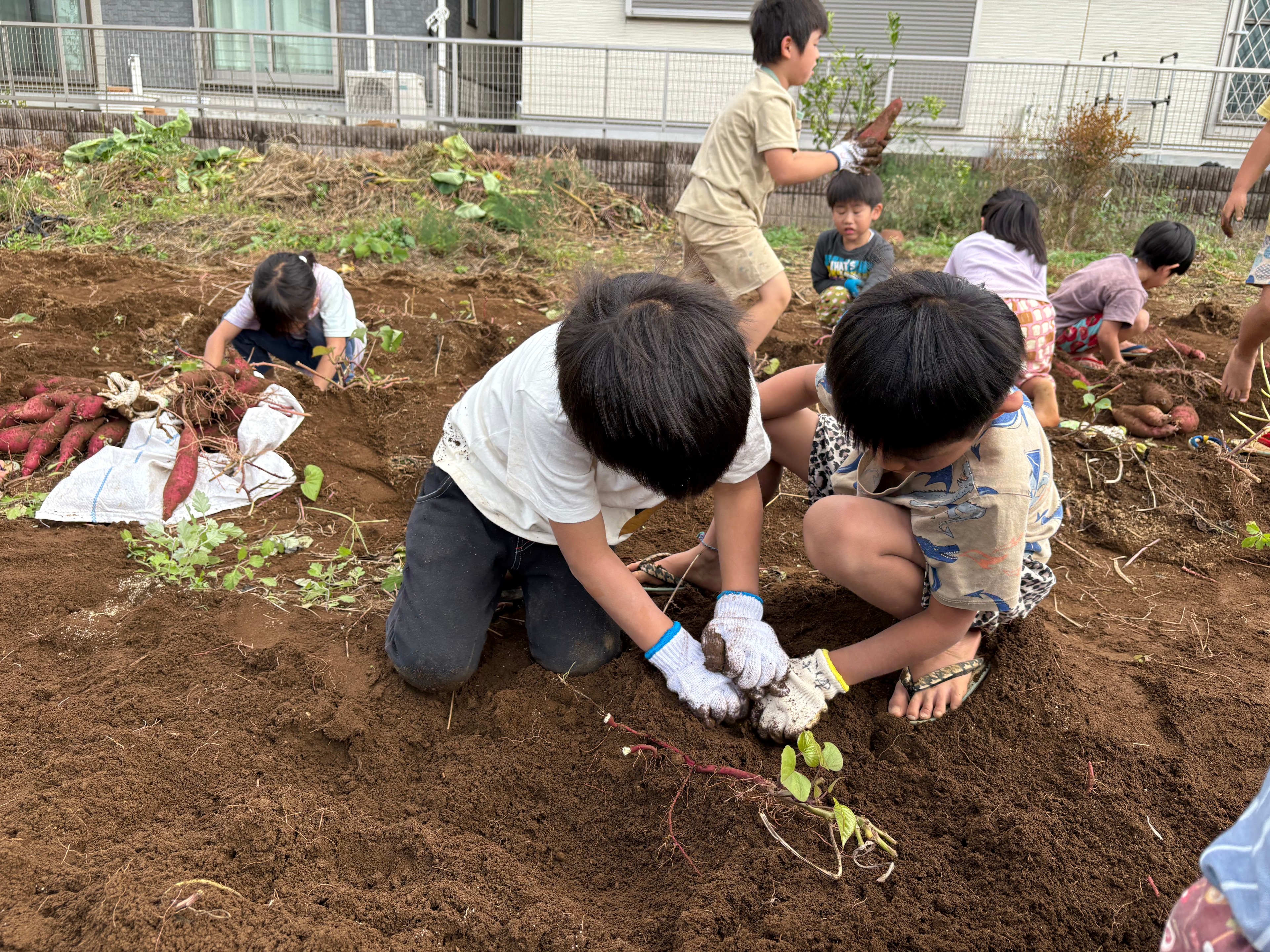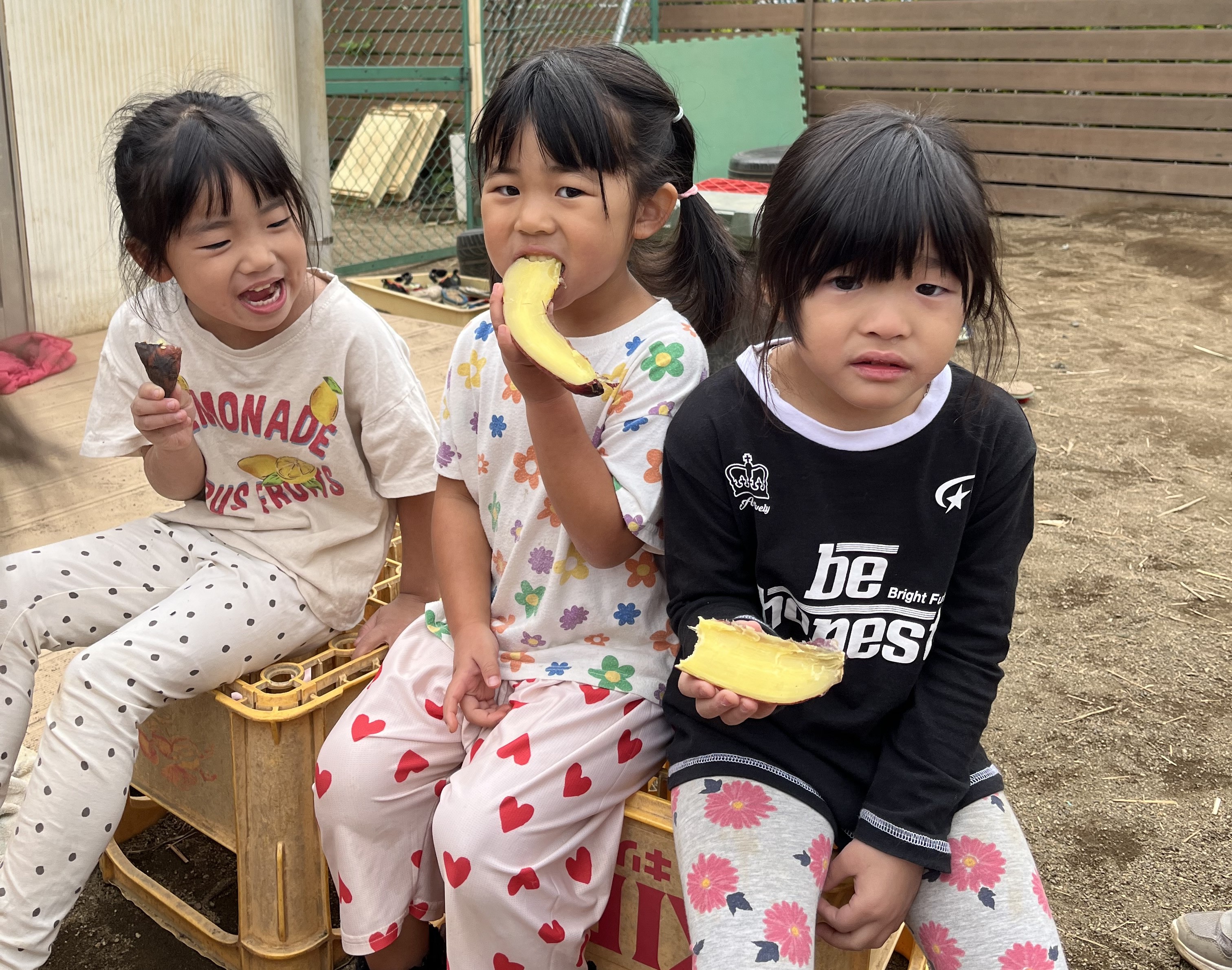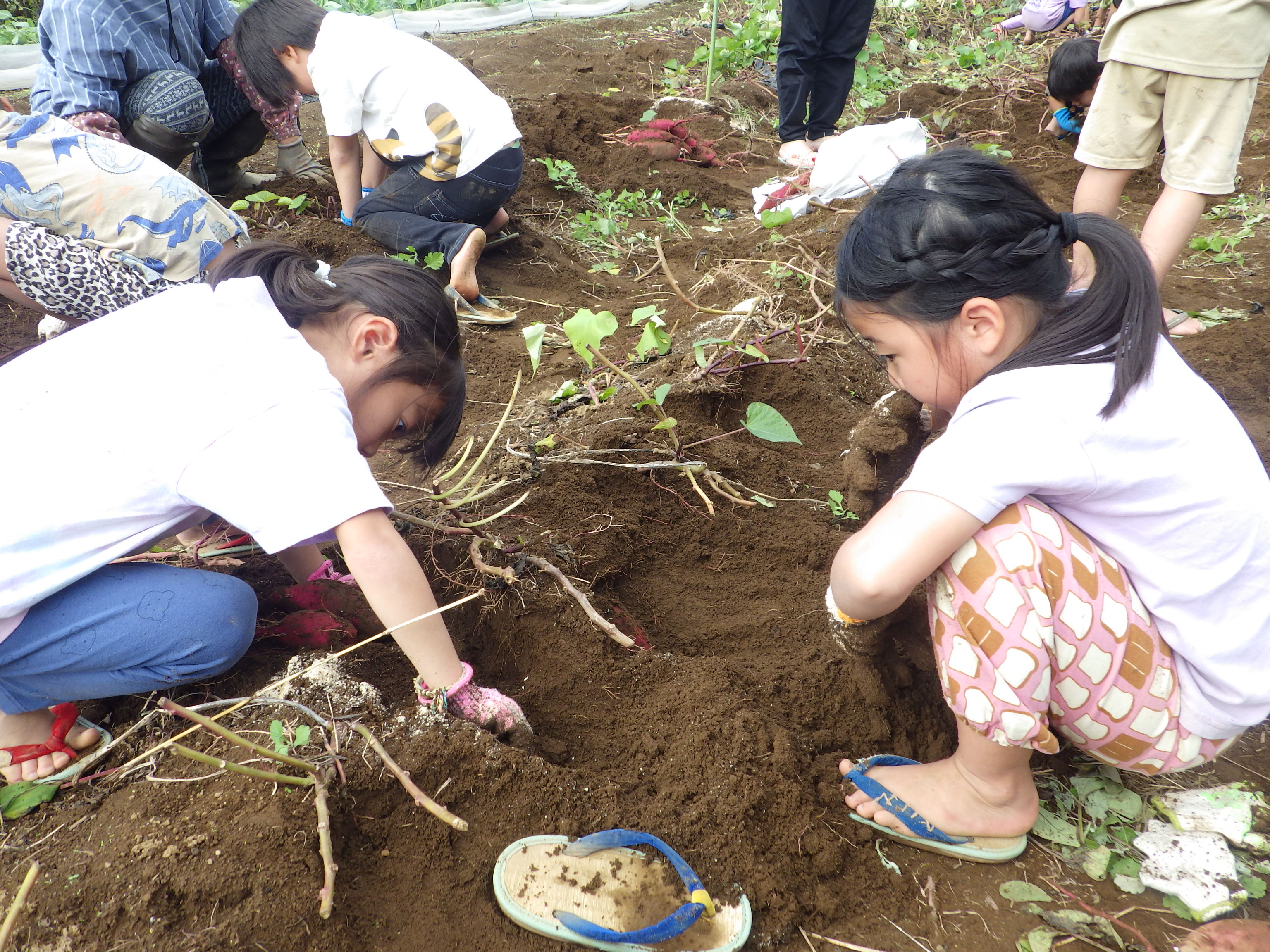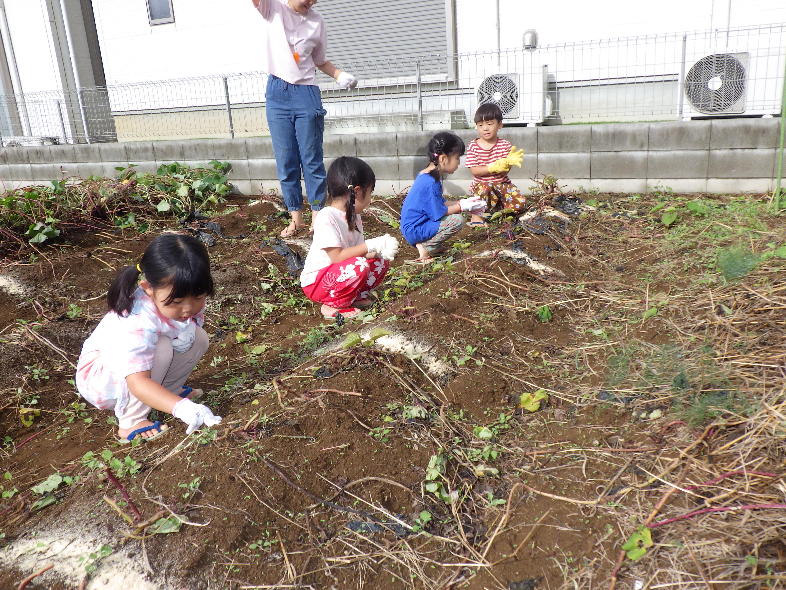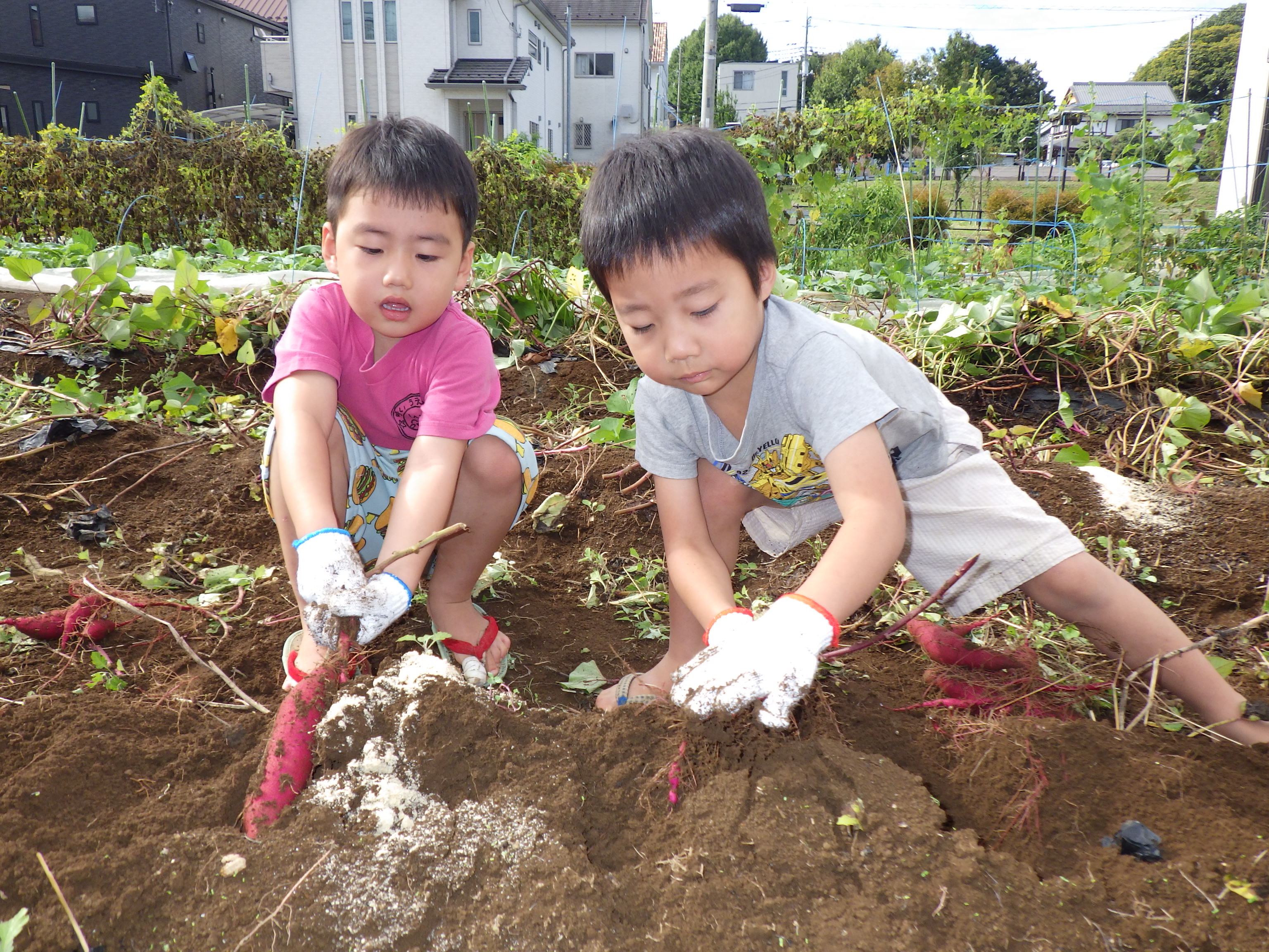 園庭にはびわ・どどめ・ザクロの木があり、子どもたちの大好きなおやつのひとつです。時期になると、手を伸ばし、実をもいで自然の恵みを味わっています。また、夏野菜の栽培を通じ、野菜を身近に感じながら本来の風味・味を楽しんでいます。