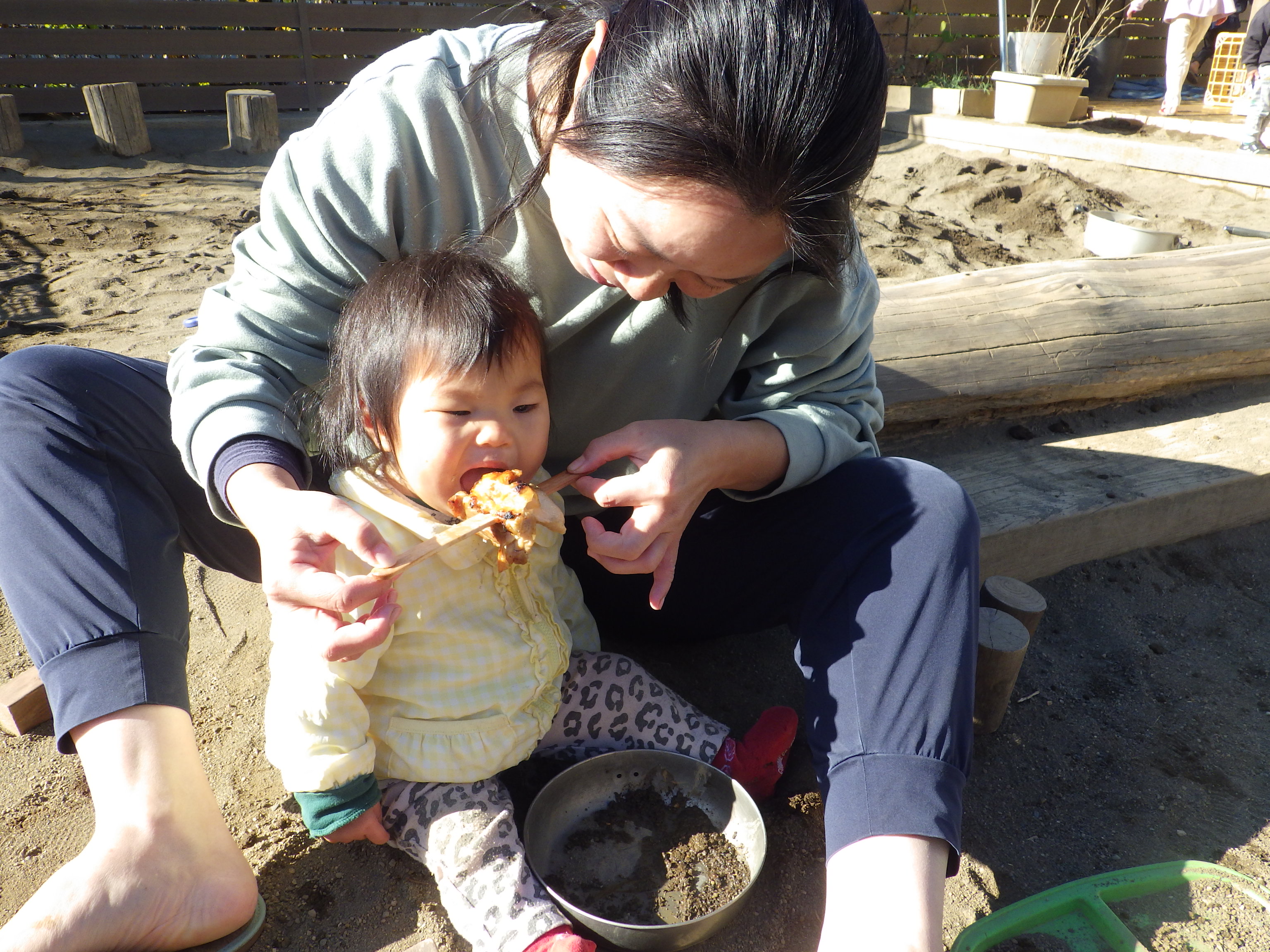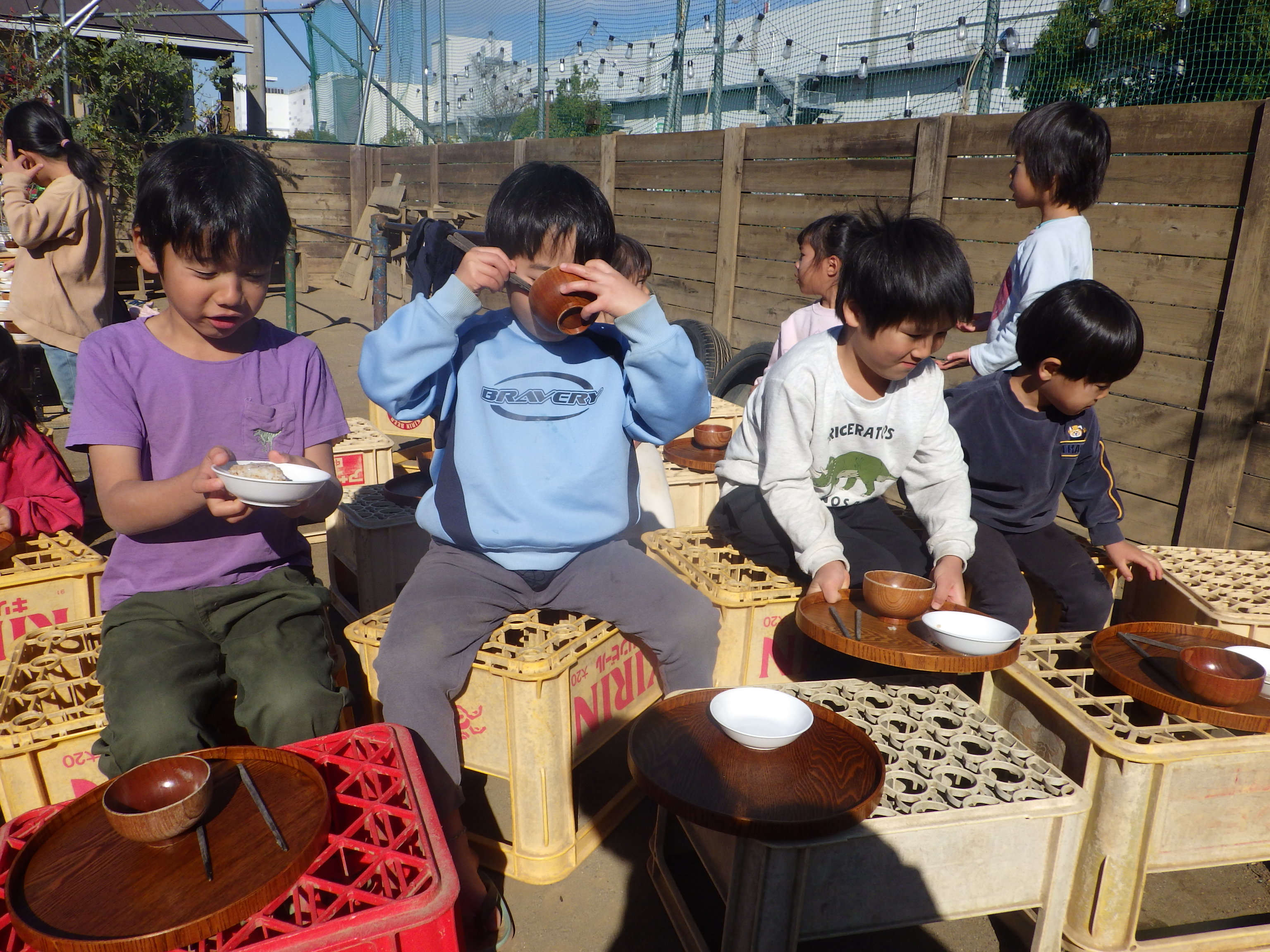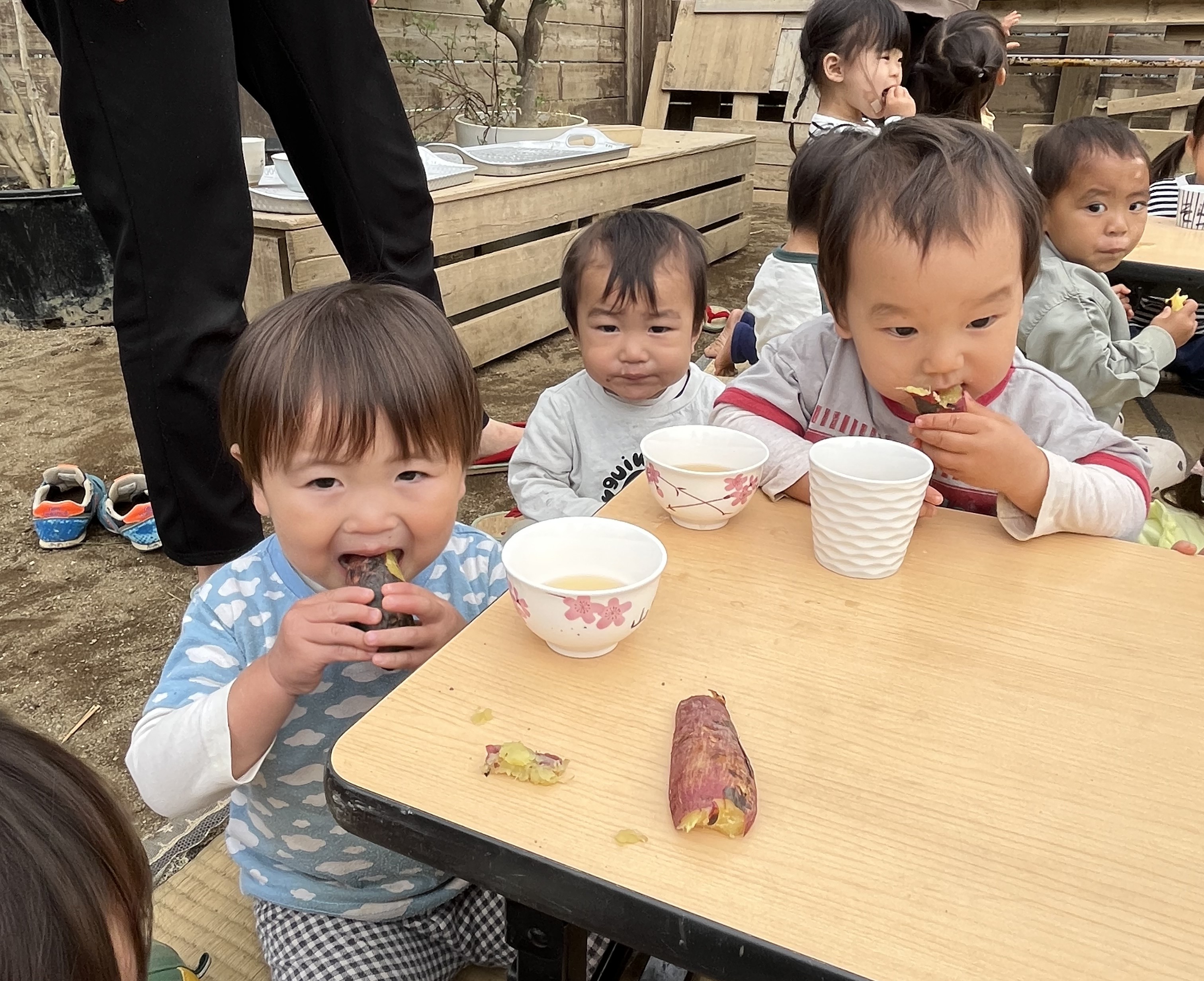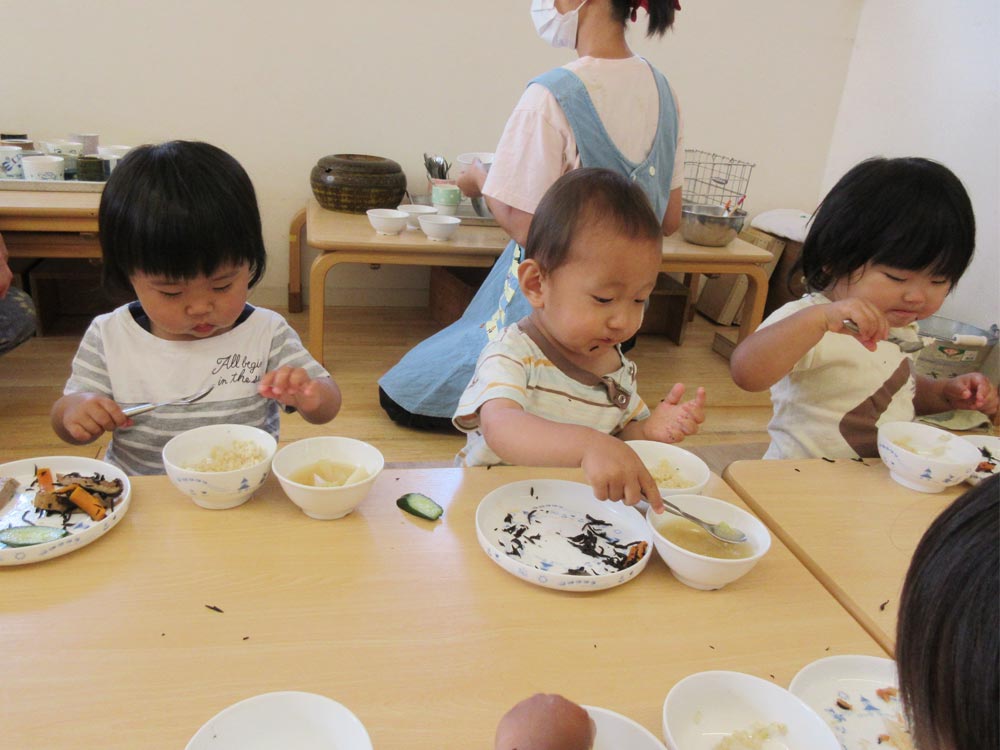 家庭的な雰囲気を大切にすること、大人と同じ食器で食べる喜びを感じることを目的として全クラス陶器の食器を使用しています。乳児期には重みのあるお皿を使うことで、手掴みをしたときにお皿が動かず、意欲をそぐことなく食べられます。
