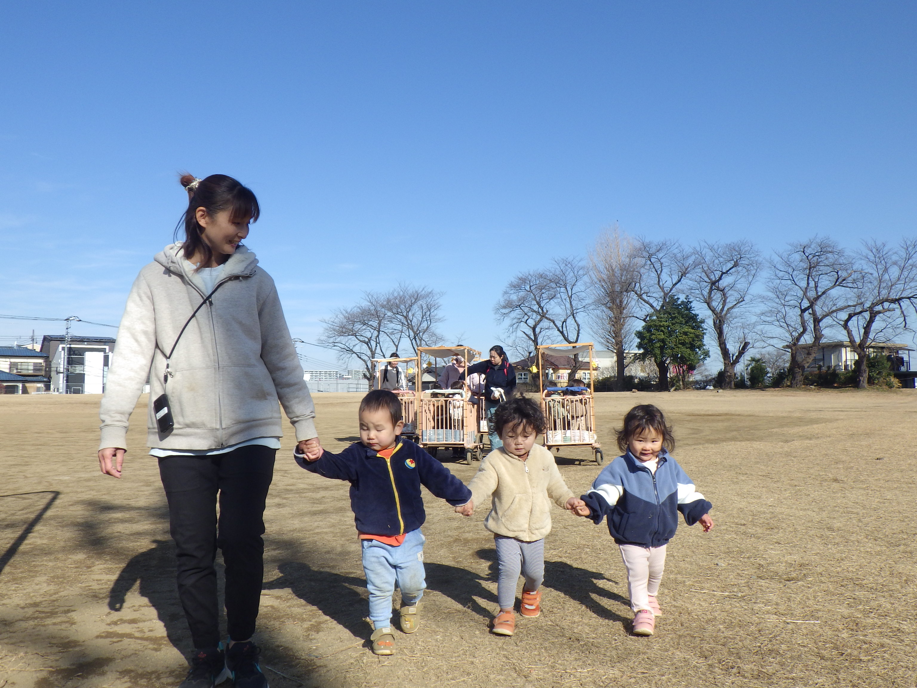 寒さが続く冬。気温が低い日は室内でのんびり過ごしますが、あたたかい時間を見計らって太陽を浴びに外へ。冬でも子どもたちは元気いっぱい楽しくあそんでいます。