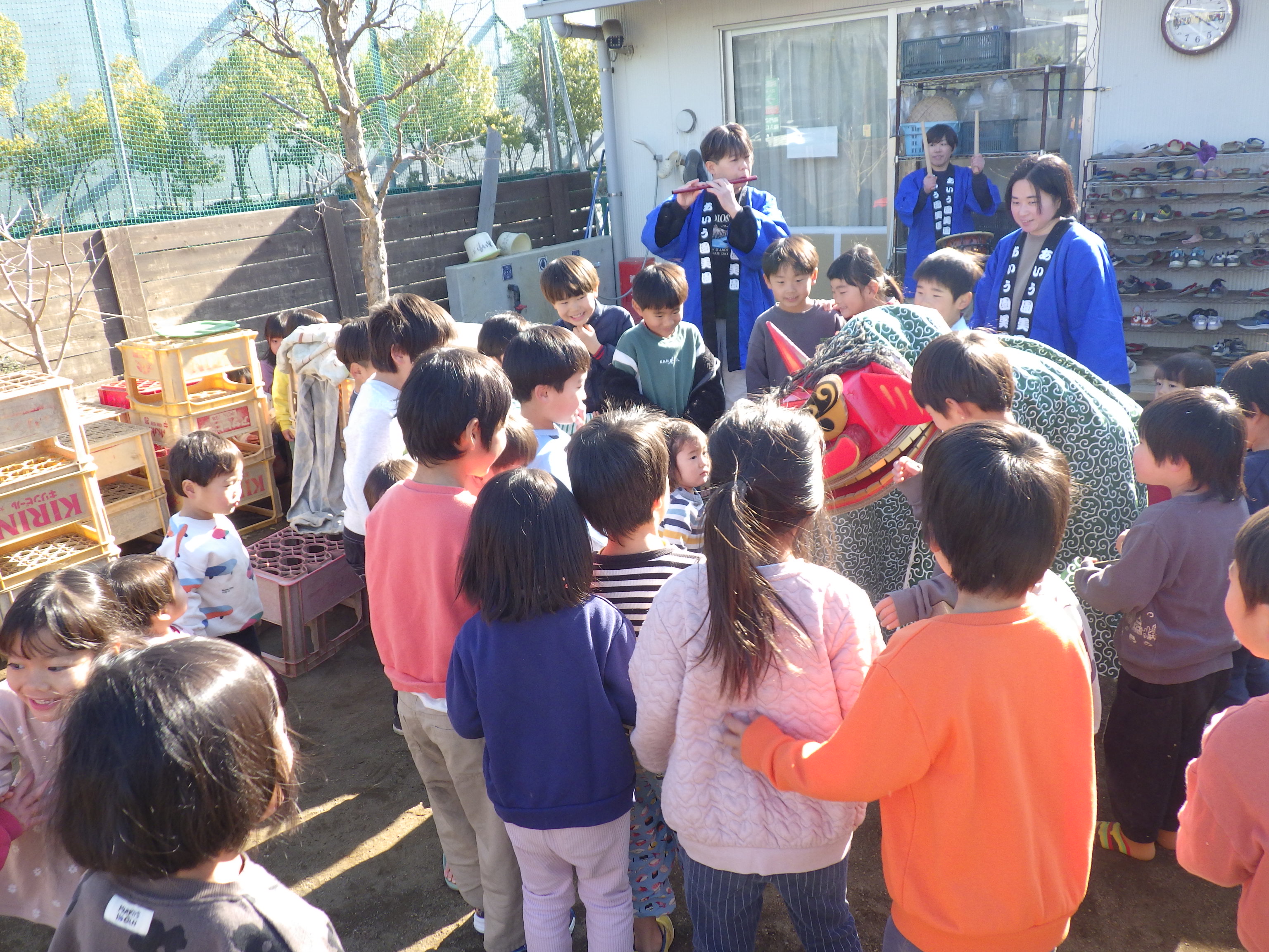 子どもたちが今年も健やかに楽しく過ごせることを願い、ししまいが園庭にやってきました。