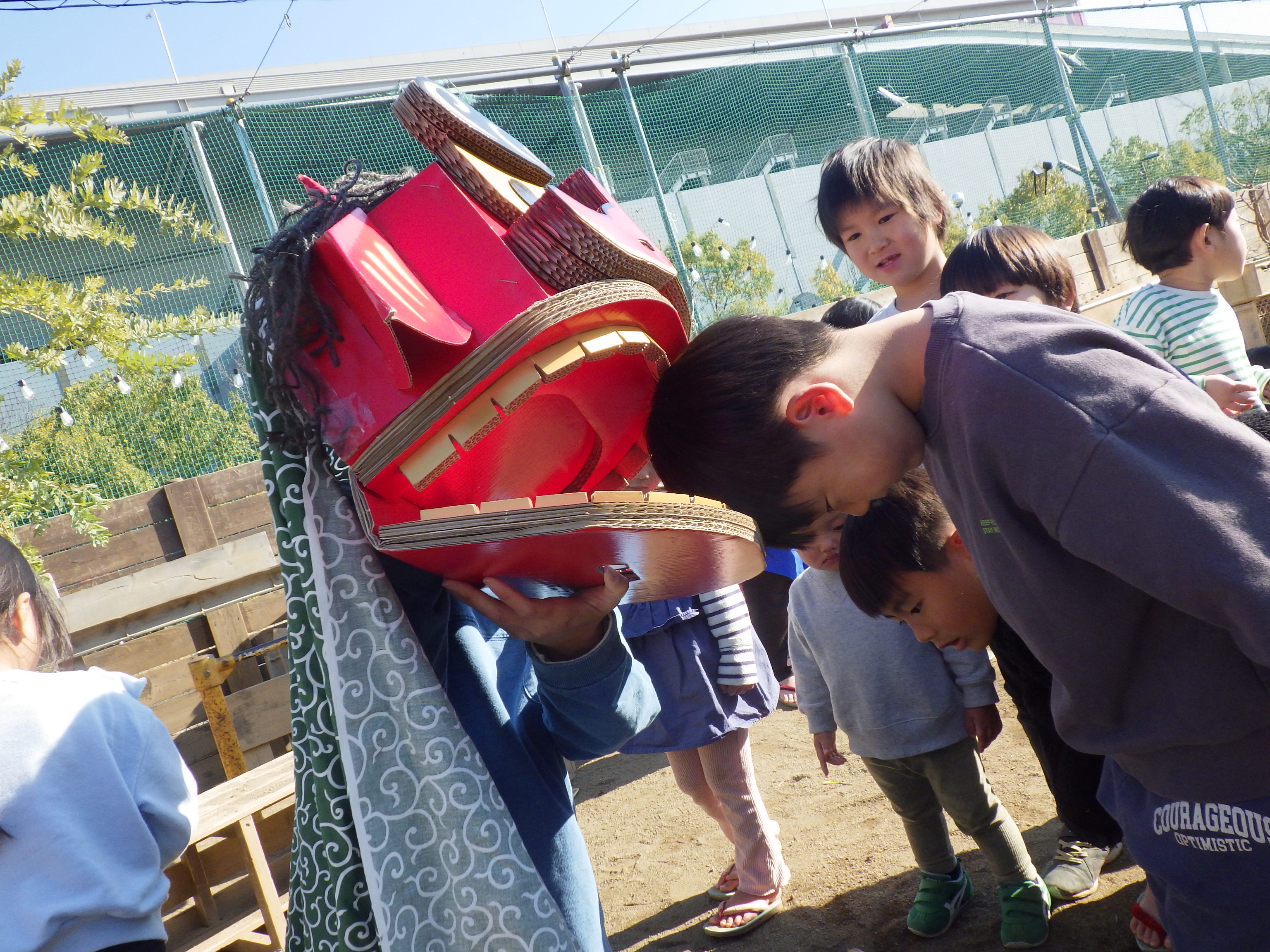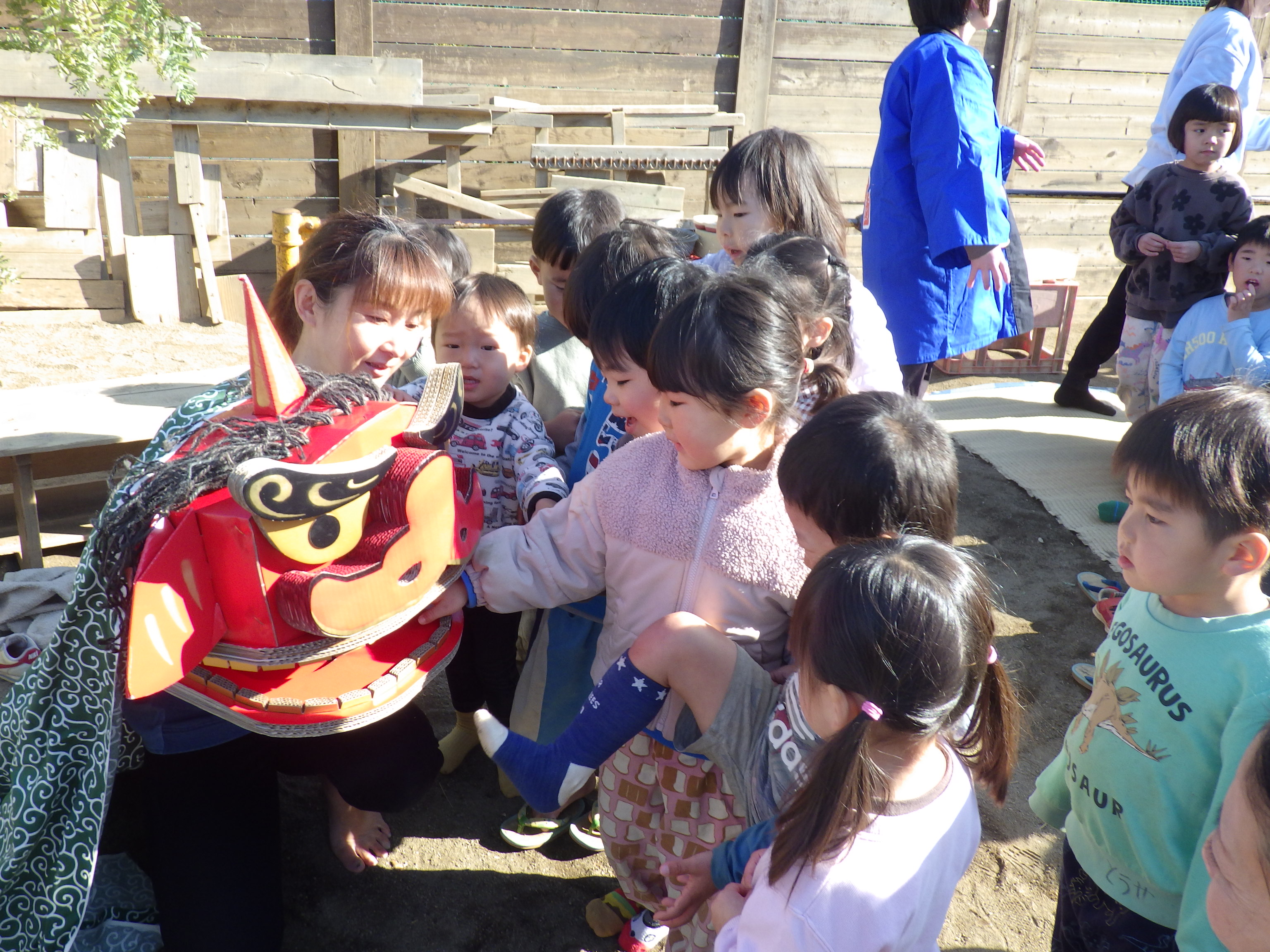 太鼓と笛の音色とともに、ししまいが悠々と登場。楽しみにしていた子どもたちにあっという間に囲まれました。少しこわいなぁ…という子は離れたところからそっと様子を伺います。